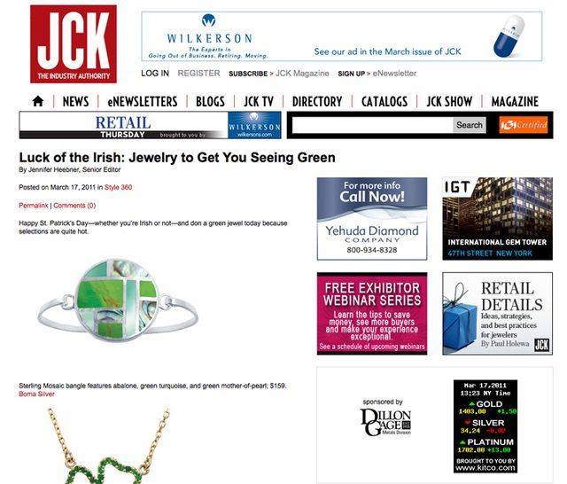 They celebrated St. Patrick's Day with a piece of our finished jewelry in editor, Jenn Heebner's Style 360 Blog.